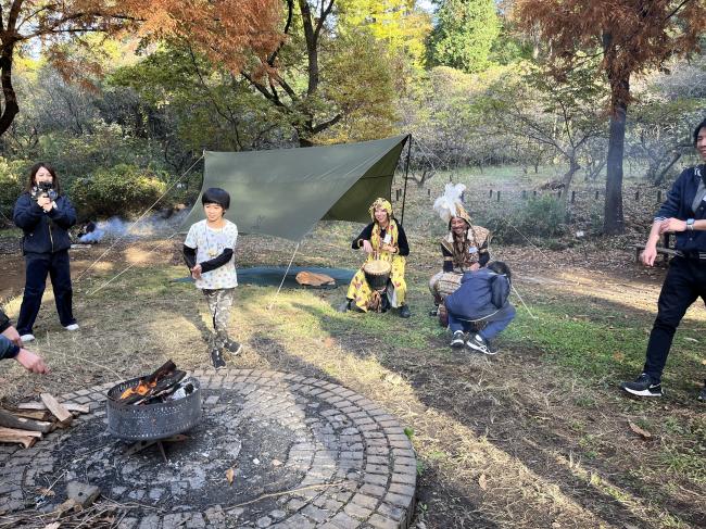 ジャンベのリズムに身をゆだねながら、子どもたちも薪や足元に落ちていた枝を手に取り、思い思いに音を鳴らし始めます。
