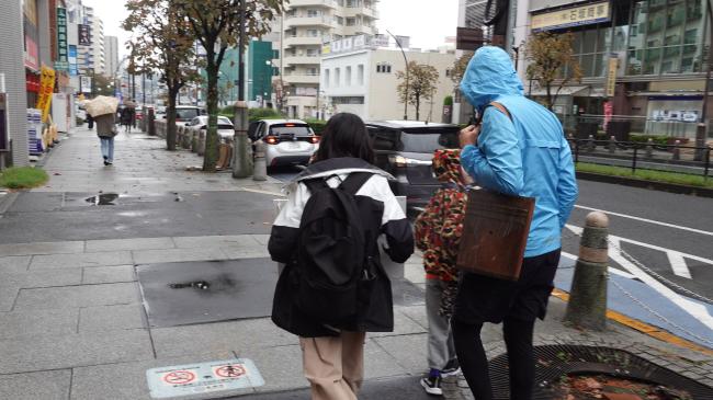 「雨の日なりの気があるかもね」と話しながら、聖蹟桜ヶ丘の街へ出発します。しっとりとした空気、走り抜ける車の音、晴れた日とは違う街の表情を感じながら歩きました。