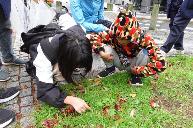 しゃがみこんで芝生の中をのぞき込み、草や木に触れながら、五感を使って「木」と「気」を探します。