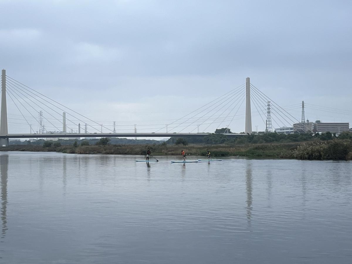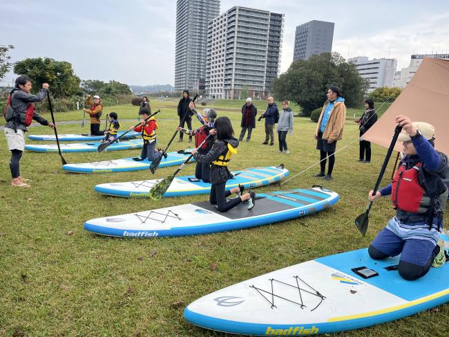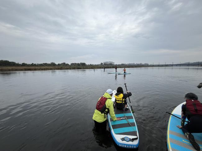 子どもたちは臆することなくボードに乗り、多摩川へと漕ぎ出していきました。