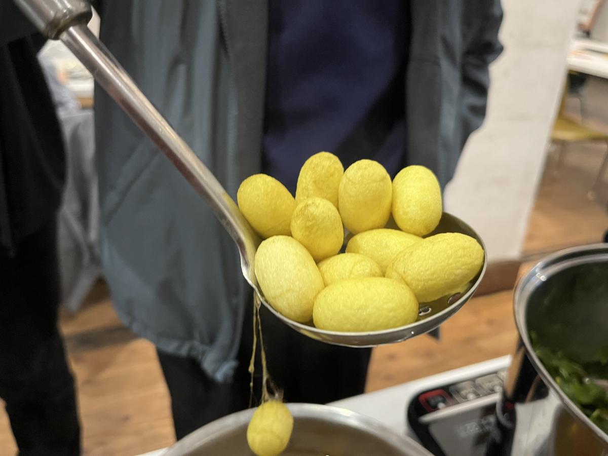 次は、その染料に繭玉を入れて染めていきます。(写真は落ち葉を煮出したもの)
