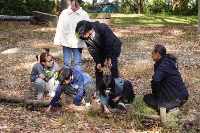 まずは蚕糸公園へ出て、材料となる赤や黄色の落ち葉、桑の葉を収穫します。自然の中から色のもとを探すところから、染めは始まります。