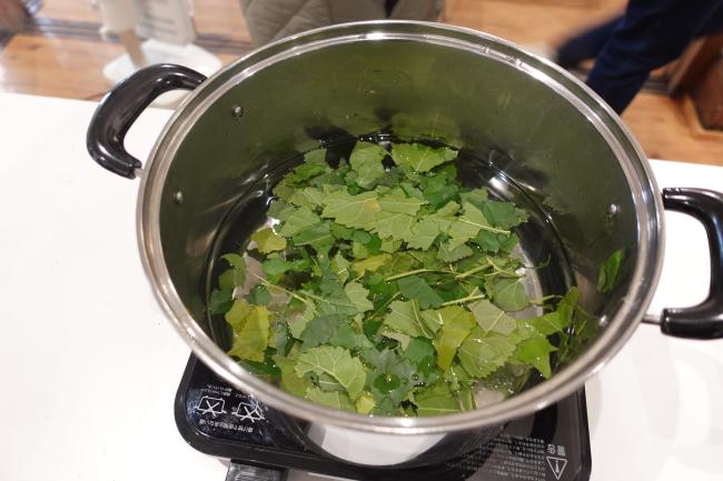 桑ハウスへ戻ると、桑の葉をちぎって細かくし、鍋でぐつぐつ煮ていきます。葉っぱから色が出ていく様子を眺めながら、「どんな色になるのだろう」と想像を膨らませていました。